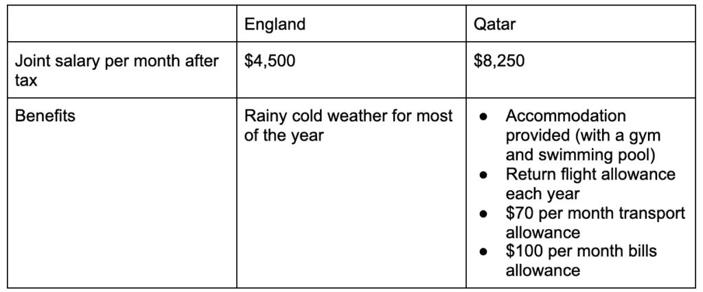 Wow, moving to Qatar is a pretty smart move — didn’t know that one could just relocate and double their after-tax income.