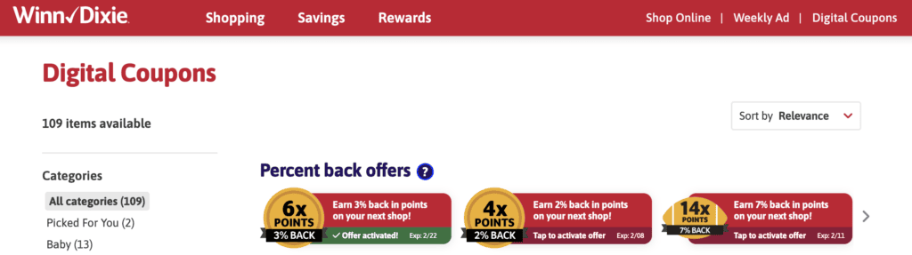 One easy way to find coupons that I’ve been doing a lot lately is logging into the site for my grocery store and “clipping” their digital coupons. There are usually coupons for fresh fruit, meat, toilet paper, and more. Plus, they usually have a cash back option that you need to activate each month. I just activated one for this month, and it was for 7% cash back on everything I buy this month – that’s a lot of money!